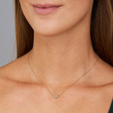 Este amuleto de diamantes en oro de 14 quilates inspira sutileza y glamour a la vez. El colgante en forma de ojo presenta diamantes pavé en las pestañas y una piedra turquesa en su centro.