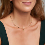 Un collar hecho a mano. La cadena en oro de 14 quilates enjoya tu escote con su brillo. A lo largo de la cadena de oro se alinean charms y piedras zirconita en diferentes colores. Puedes completar el look con la pulsera o la tobillera a juego.