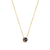 Místico, sutil y elegante. Un colgante en oro de 14 quilates que presenta una luna y un diamante brillante como una estrella. Esta pieza esta pintada a mano en esmalte azul. Ambos lados del colgante son idénticos, de manera que siempre lucen por igual.